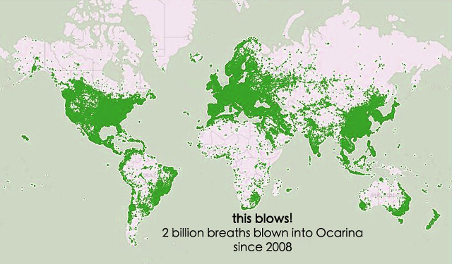 The Globe visualization in Ocarina. Listening to people blow into their phones from